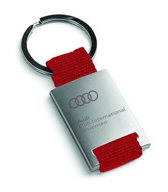 Prívesok na kľúče s logom Audi Clubu a klubovým sloganom Enjoying Audi Together. Prívesok je vyrobený z kombinácie kovu, textílie a brandovaný gravírom. Dodávaný je v darčekovej krabičke.