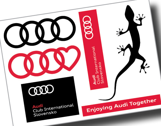 Hárok vo formáte A5 s viacerými nálepkami s klubovými a Audi motívmi s povrchovou lamino úpravou.