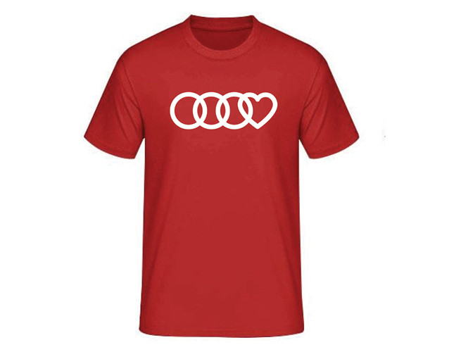 Pánske tričko s motívom Audi kruhov a srdca + nápis Enjoying Audi Together na chrbte (sieťotlač, 100% bavlna).